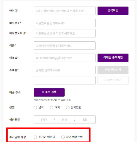 마켓 컬리는 가입 시 추천인 아이디와 참여 이벤트명을 선택해서 혜택을 받을 수 있게 되어있습니다.